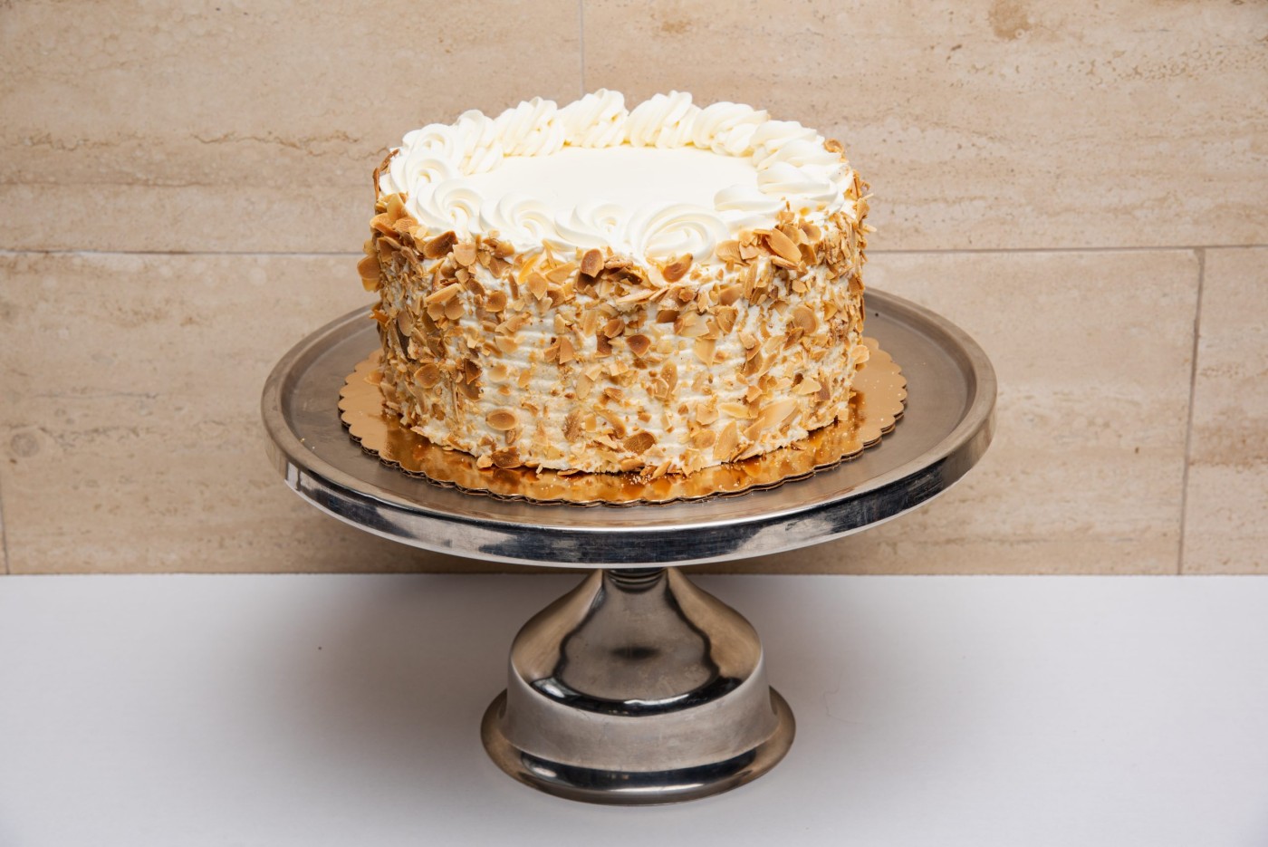 Indulge in the delightful Burnt Almond Cake: a moist vanilla cake filled with layers of toasted almond mousse, fluffy whipped cream, and topped with crunchy toasted almonds.